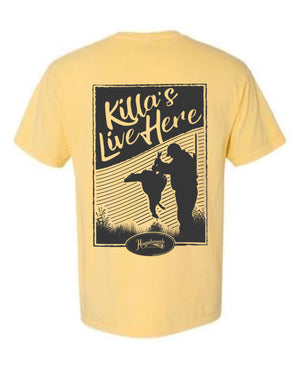 The Killa’s Live Here Comfort Color Tee lets folks know exactly where you stand. Printed on a soft, Comfort Color tee in Butter Yellow featuring the bold "Killa’s Live Here" back graphic with a silhouette of a successful turkey hunter.